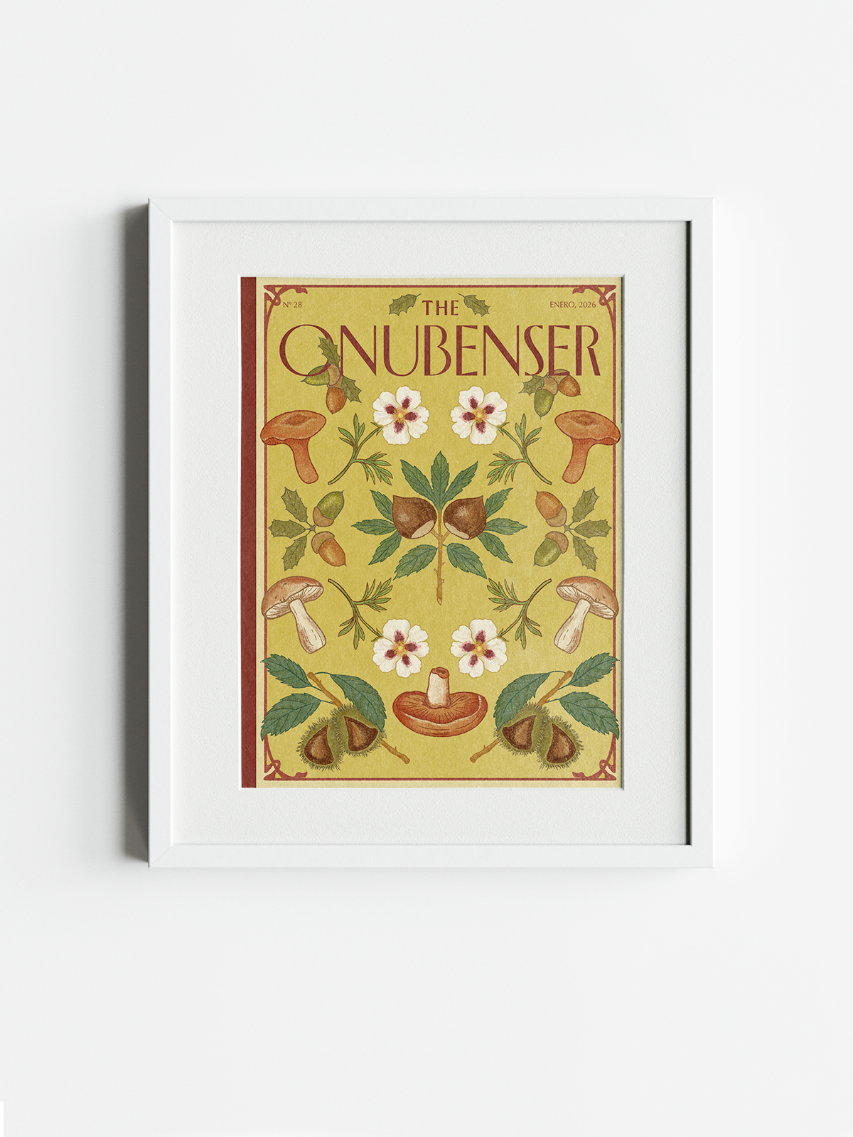 Quería capturar ese paisaje gastronómico sin recurrir a un plato concreto, explorando los elementos naturales que lo sustentan: las bellotas de encinas y alcornoques, las castañas asadas que tanto comemos en casa en esta época, y las jaras que, aunque florecen más tarde, siempre forman parte de mi imaginario cuando pienso en estos paseos. (Fun fact: hasta tuve un hámster que se llamaba Jara cuando era pequeña). En cuanto al estilo, siempre me han fascinado los ornamentos, azulejos, cenefas y el Art Nouveau. Intenté recrear un concepto intermedio entre el arte publicitario popular del siglo XX y las antiguas láminas de libros de botánica, buscando esa composición simétrica y decorativa característica de ambos. Con estas ilustraciones siempre intento apreciar y elevar esos momentos que parecen cotidianos, pero que me gusta memorizar en detalle.»